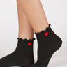 A little love for your feet. These comfy socks feature frilly edge with a sweet heart detail — perfect for adding a pop of fun to your everyday look. Whether you're lounging at home or showing them off with your favorite sneakers, these socks bring the cozy and the cute. Because love is in the... sole.