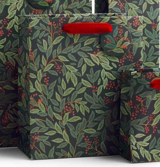 Printed in full color and foil and UV glitter stamped. Velvet ribbon handles and a coordinating gift tag with "to" and "from" on the back.