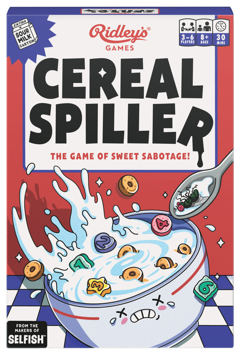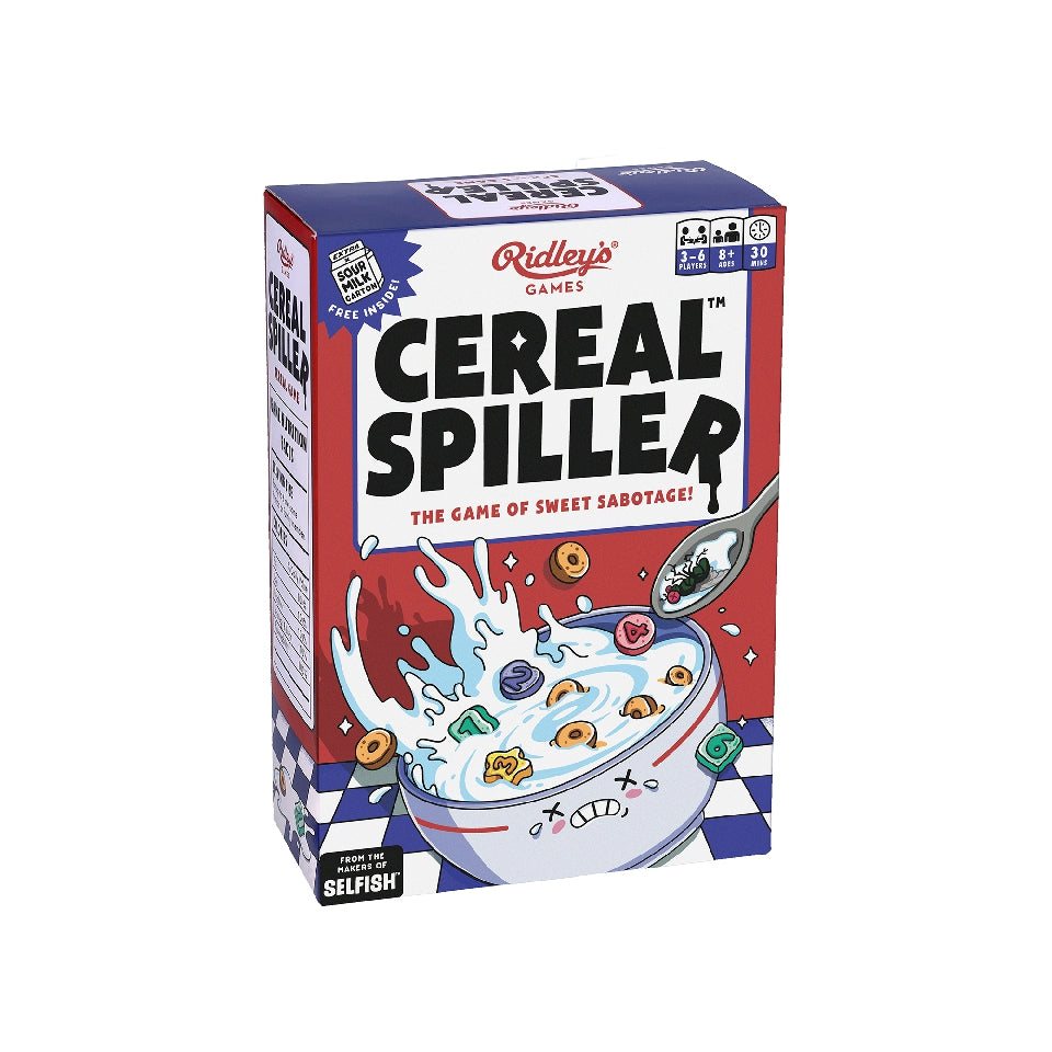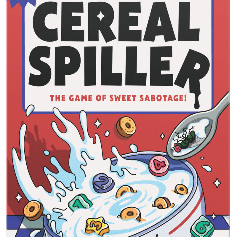 It is often said that Cereal Spillers have a type, so the more matching tokens you collect, the more you'll score. Use the actions to mix things up, seek the magic charm you crave, avoid floaters that'll drag you down, and beware of the dead flies that can ruin your day. Made for people who love eating cereal from the box but would never ever share, this game is suitable for ages 8+, 3-6 players, and has an average 30-minute gameplay. Inside the box you'll find six Cereal Bowls, Spilled Milk board, 48 Cereal tokens, 27 Action tokens, Sour Milk carton, scorepad, and English and Spanish instructions. To win, you must sabotage your competition to fill your Bowl with matching Cereal. But beware your opponents can get you back! On your turn, either reveal Cereal in your Bowl, draw Cereal from the box, or play an Action. Cereal tokens score points when they are next to other tokens of the same number or color-after all, they say Cereal Spillers have a type. Floaters (or "single tokens" if you wanna be dull) will score you nothing, zilch, nada. Stir things up by switching two tokens in any player's Bowl or get sneaky and Swap one token in your Bowl for one in another player's Bowl. Always be on the hunt for the Magic Charm which matches anything and everything. And watch out for the Dead Flies that will lose you points and ruin your day. The player who absolutely kills this breakfast challenge and has the highest score after three rounds is the winner. Last place gets the Sour Milk and should be grateful for it. Loser.