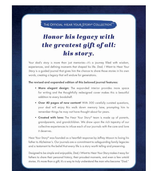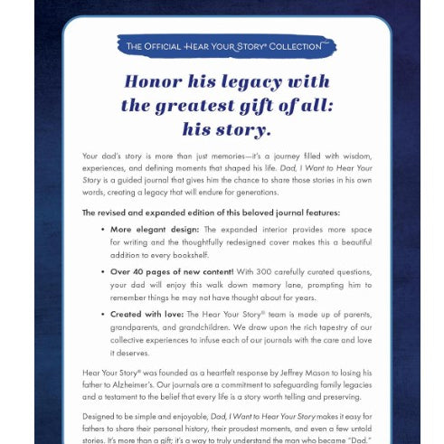 More elegant design: The expanded interior provides more space for writing and the thoughtfully redesigned cover makes this a beautiful addition to every bookshelf. Over 40 pages of new content! With 300 carefully curated questions, your dad will enjoy this walk down memory lane, prompting him to remember things he may not have thought about for years. Created with love: The Hear Your Story® team is made up of parents, grandparents, and grandchildren. We draw upon the rich tapestry of our collective experiences and perspectives to infuse each of our journals with the care and love it deserves.