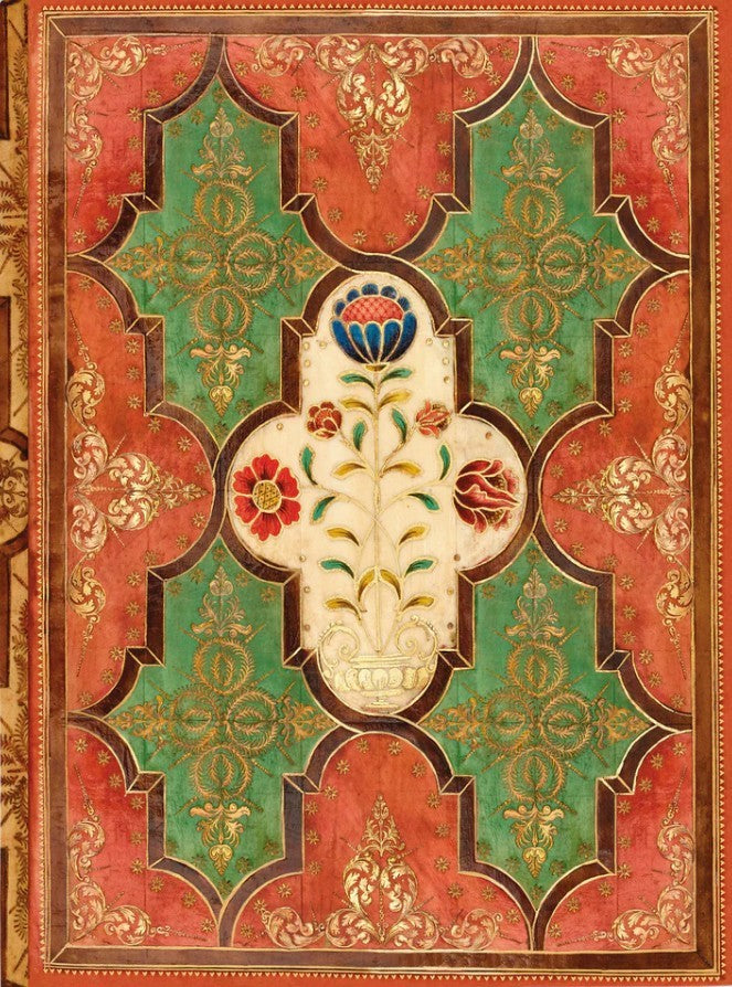 Elegant journal reproduces a tooled book binding inspired by folk art stylings popular in 18th-century Europe.