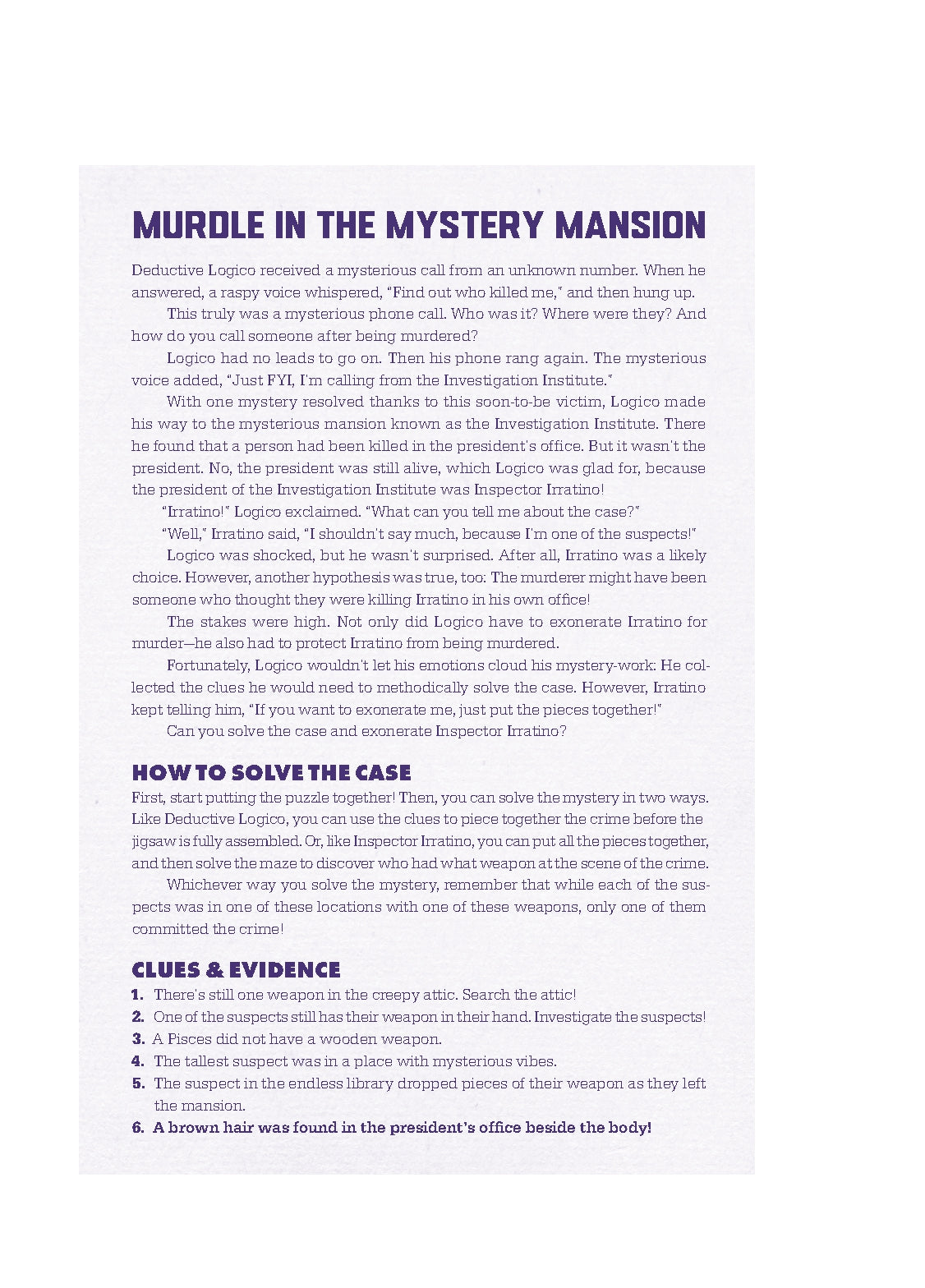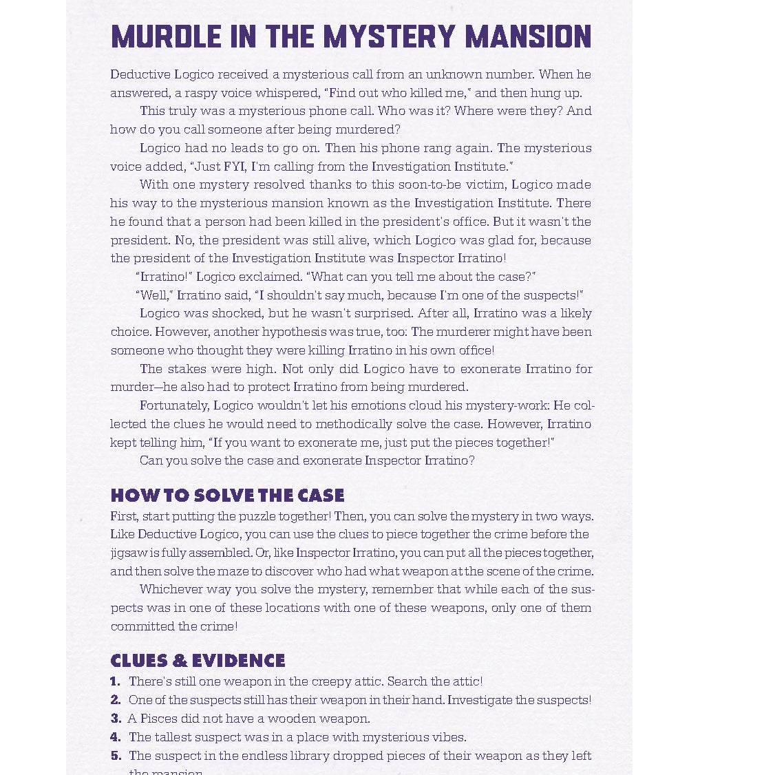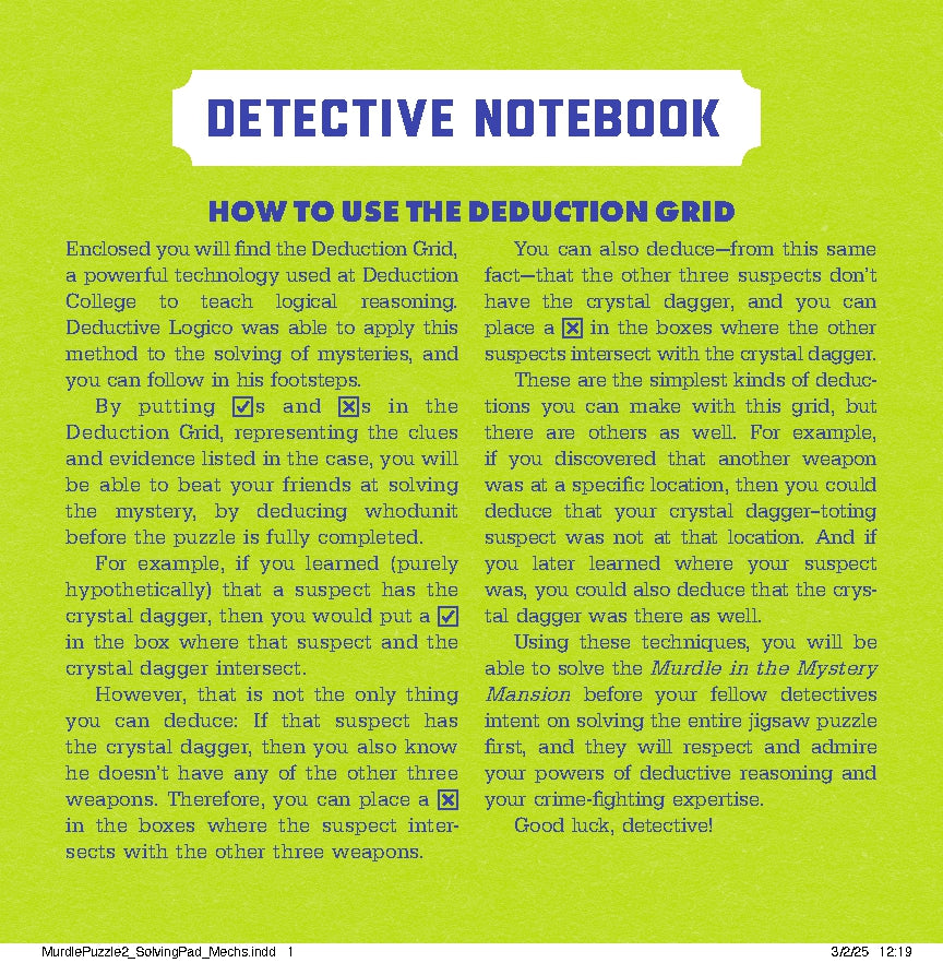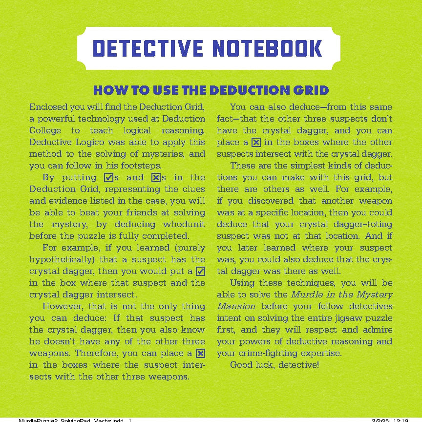 TRIPLE THE PUZZLING FUN: Shrug on your trench coat and put on your best thinking cap because this all-new form of Murdle mystery includes a logic puzzle, a jigsaw puzzle, and a surprise maze. Don't miss out on this unique chance to build the scene of the crime from the ground up, filling your detective notebook with clues along the way.