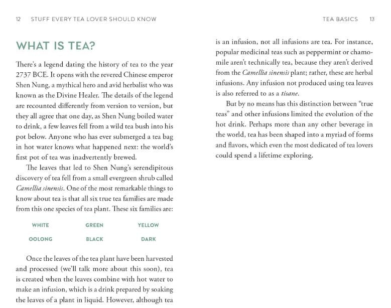 Tea is one of the most popular beverages in the world—second only to water. And there's so much to learn and try beyond the colorful boxes in the grocery store. Like wine and beer, each tea variety has its own distinct history, source, and flavor profile, from Darjeeling to matcha to Silver Needle. Tea is also embedded in the traditions of many cultures around the world and is shared with others through distinctive ceremonies that include unique customs, foods, and accessories. Within the pages of this pocket-sized guide, you’ll find information, how-tos, and trivia for tea lovers of all levels. Experts and newbies alike will learn about