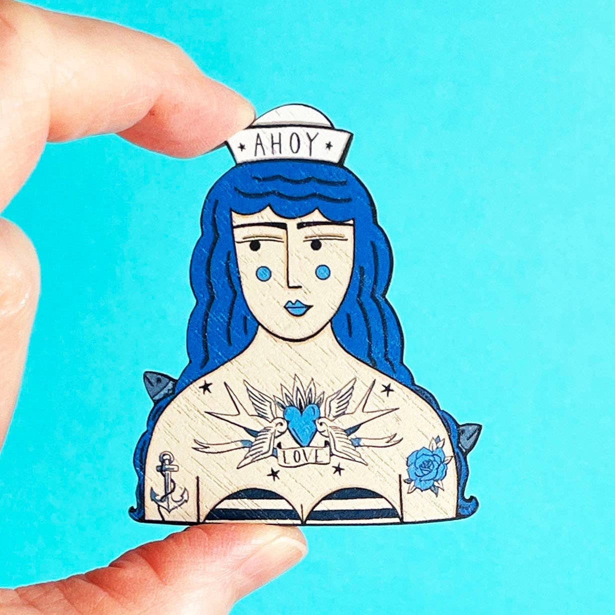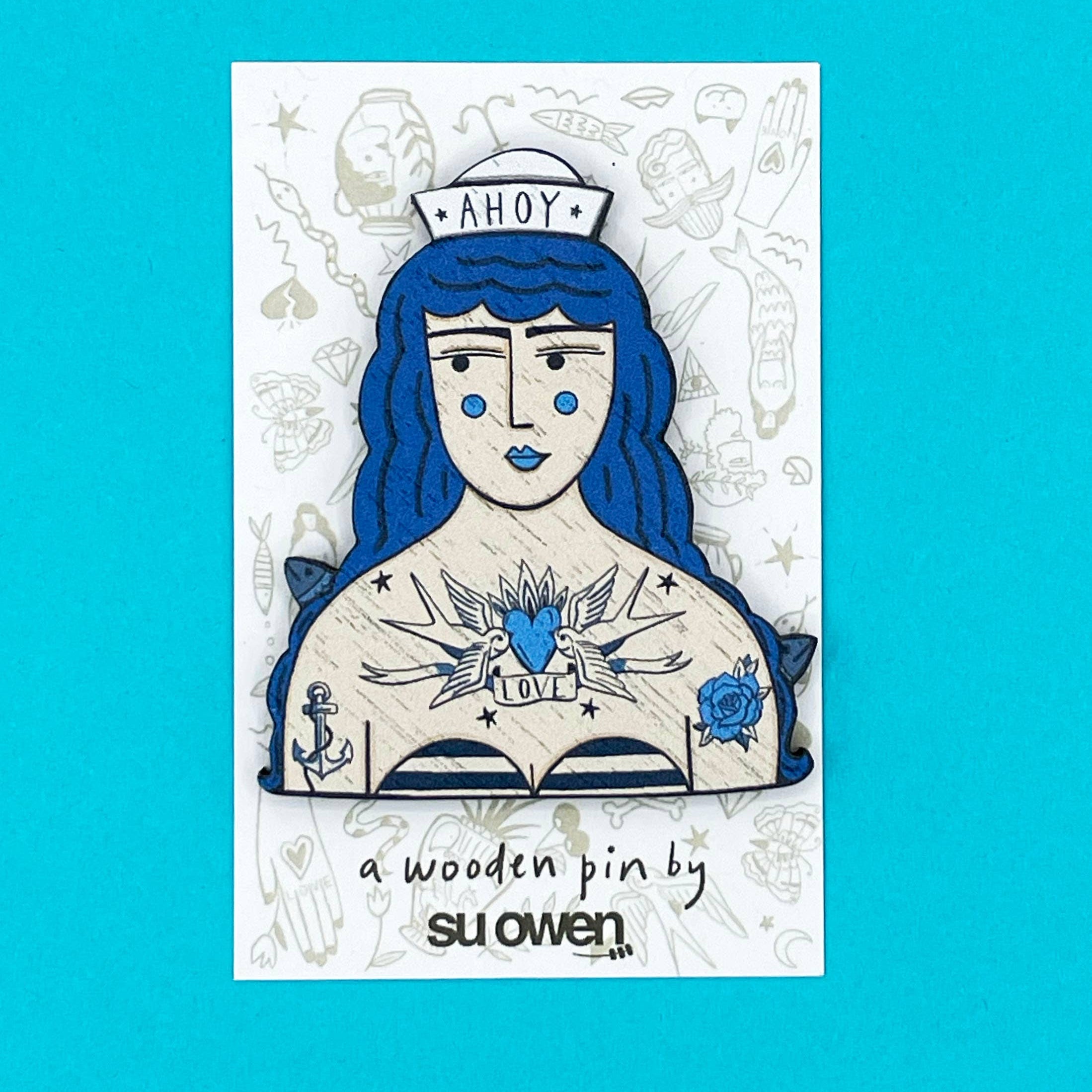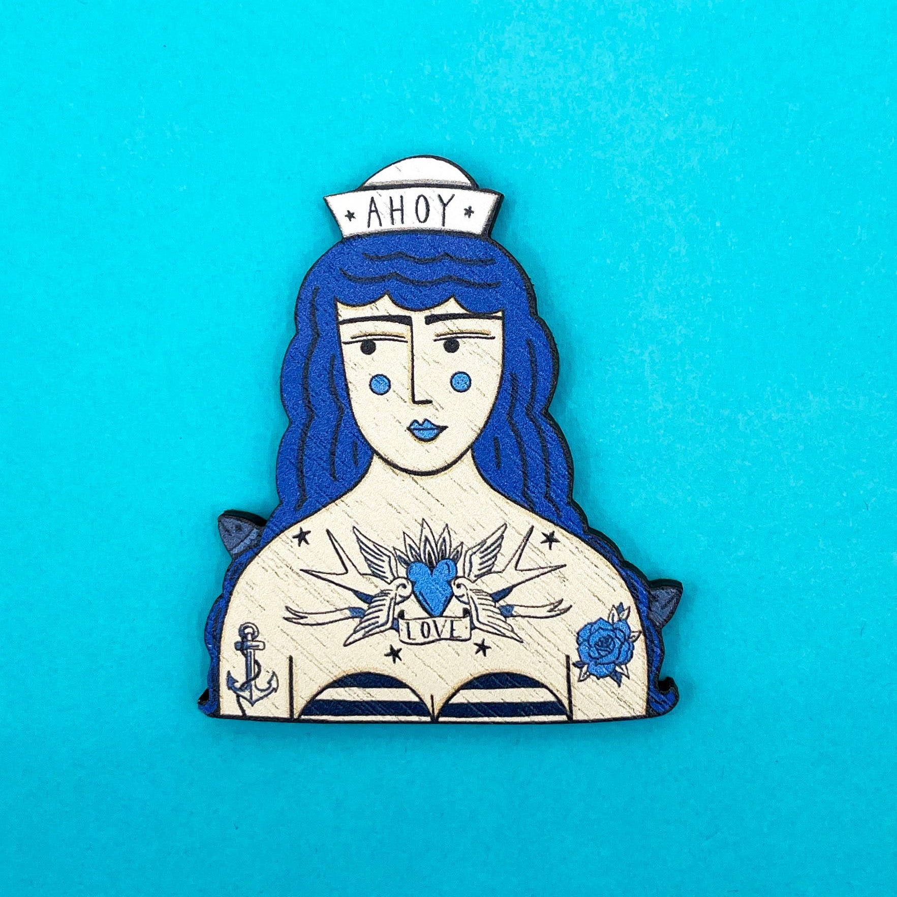 Ahoy!! A fun nautical brooch of a tattooed sailor girl, she's wearing a rather fetching hat and has traditional nautical tattoos. The brooch is made from an original illustration by Su Owen. Printed and lasercut in the UK from sustainable walnut wood. Measures approx 2.5 x 2 inches.