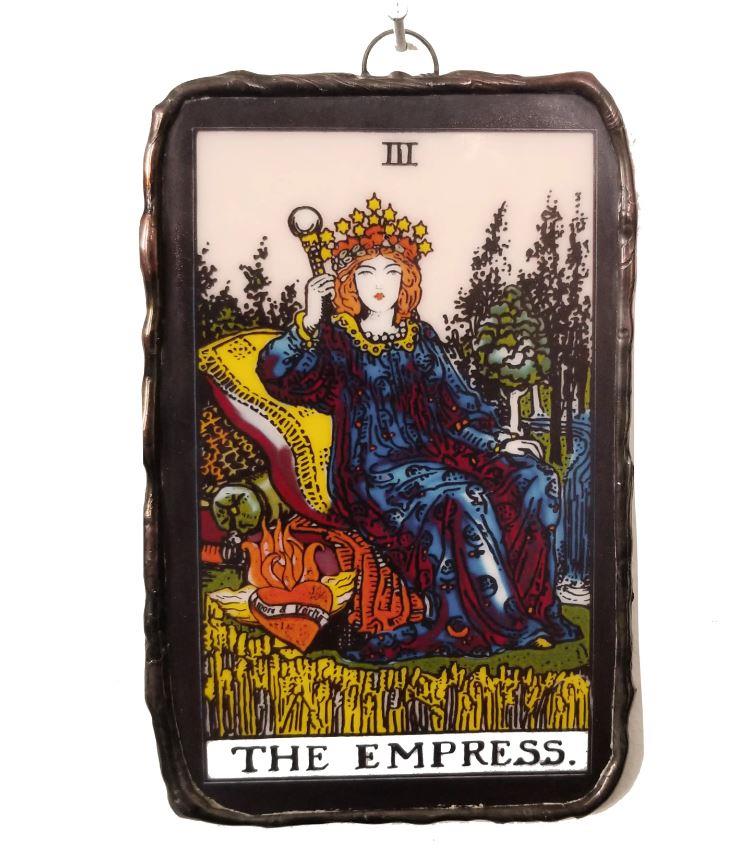 The Empress Card The Empress is associated with maternal influence, it is the card if you are hoping to start a family. She can represent the creation of life, romance, art, or new business. 5 inches tall, enameled illustration on translucent White Milk Glass. Perfect for wall or window