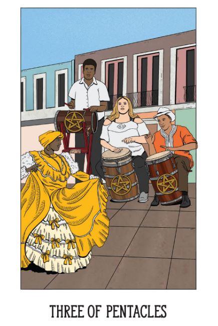 Latinx tarot readers, enthusiasts, and experimenters who don’t see themselves reflected in the classic card decks will connect deeply with the wisdom of this deck. Rather than trying to connect with symbolism that doesn’t resonate, these readers will gravitate towards the creative symbolism in Secrets of Paradise Tarot: Spanish Fans replace Swords, the Ace of Cups features La Virgen de la Providencia looking down at Puerto Rico, the Five of Wands illustrates Cocobalé, a type of martial arts, and the Dame of Pentacles–which replaces the Knight of Pentacles–shows a Flamenco dancer in motion.