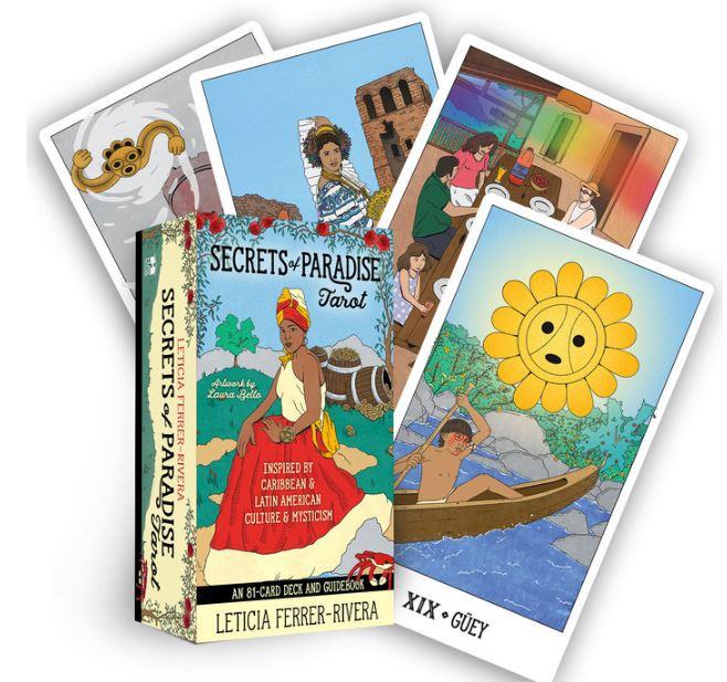 Secrets of Paradise Tarot is an inclusive tarot deck like no other, taking a Caribbean and Latin American approach to symbolism. It’s an invitation to discover the hidden secrets of paradise and many beautiful aspects of Latin culture through the sacred art of tarot. This deck showcases religious practices from the Caribbean islands and throughout Latin American countries as well as highlighting local food, animal species, natural and historical landmarks, and music, art, and culture.