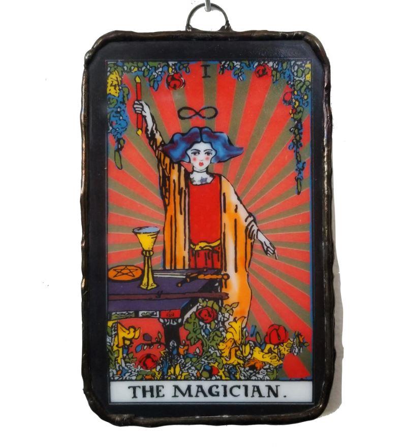 The Magician Card points to talents and capabilities, resources that the Querant has at his or her disposal to create success. 5 inches tall, enameled illustration on translucent White Milk Glass. Perfect for wall or window.