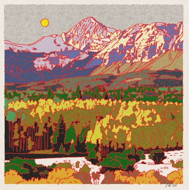 Bold, vibrant, and full of mountain magic, this bright-coloured Rocky Mountain Print captures the iconic peak in a fresh, eye-catching palette.