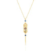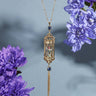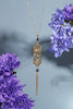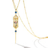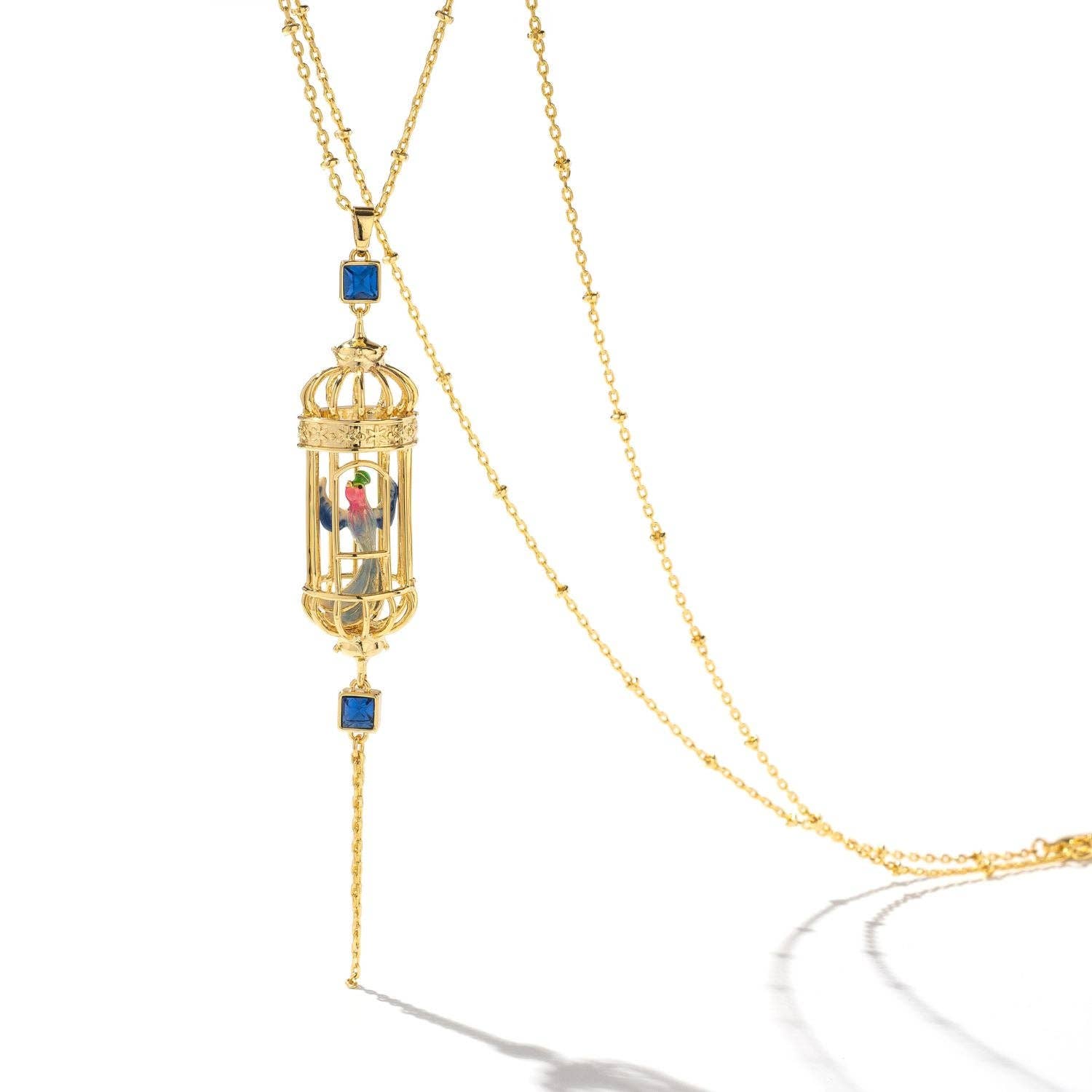 This bird cage drop pendant demonstrates expert craftmanship. A hand enamelled bird sits inside an intricate gold plated cage. Presented on an 18ct gold plated bead chain with delicate gold tassels this pendant is a real taking piece.