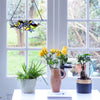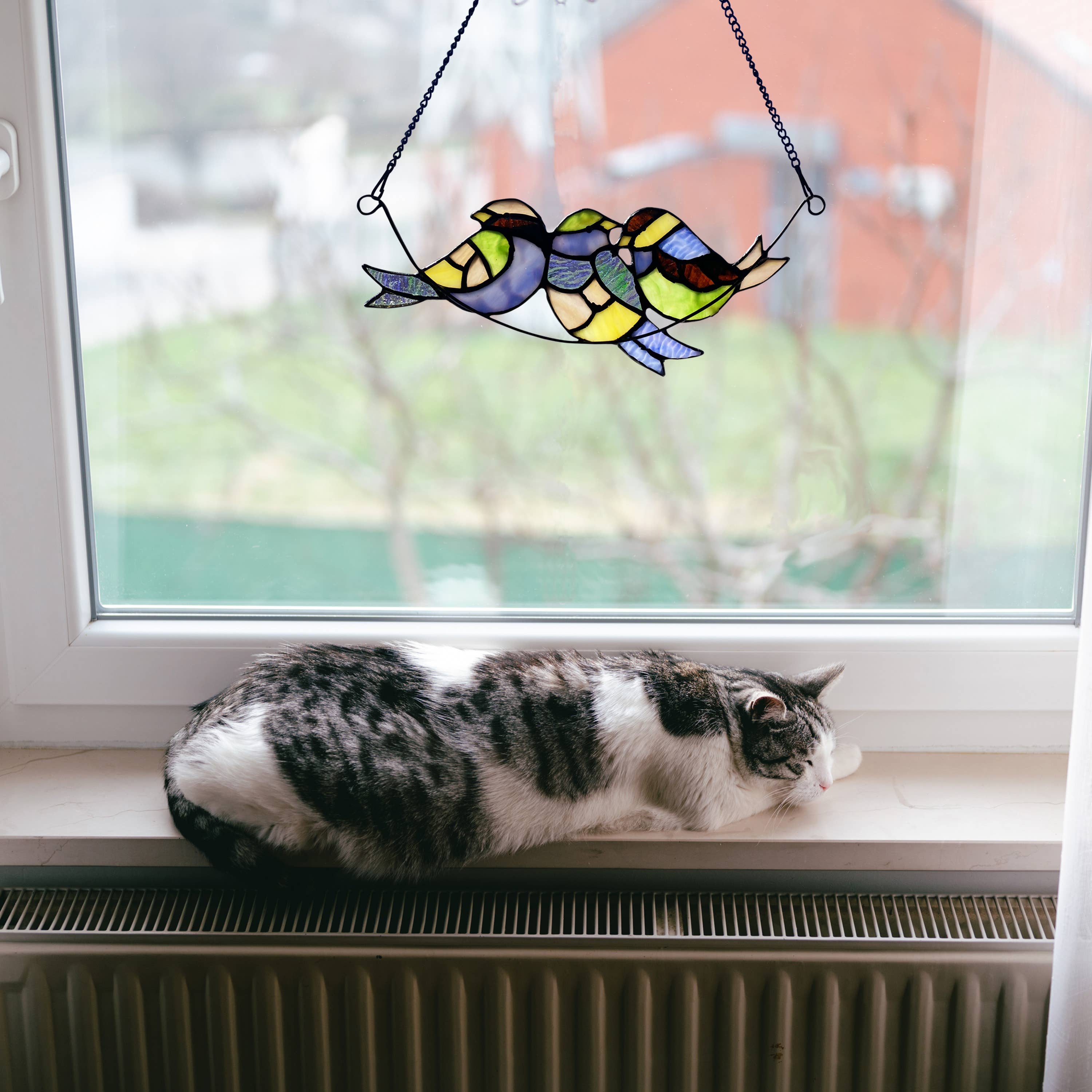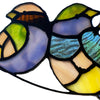 This Peyton Blue Three Birds Stained Glass Window Panelwill add sweet charm and colorful light to any space in your home. Handcrafted from 31 individual textured glass cuts in blue, green, yellow and orange hues, the design showcases three cute birds perched together on a branch.