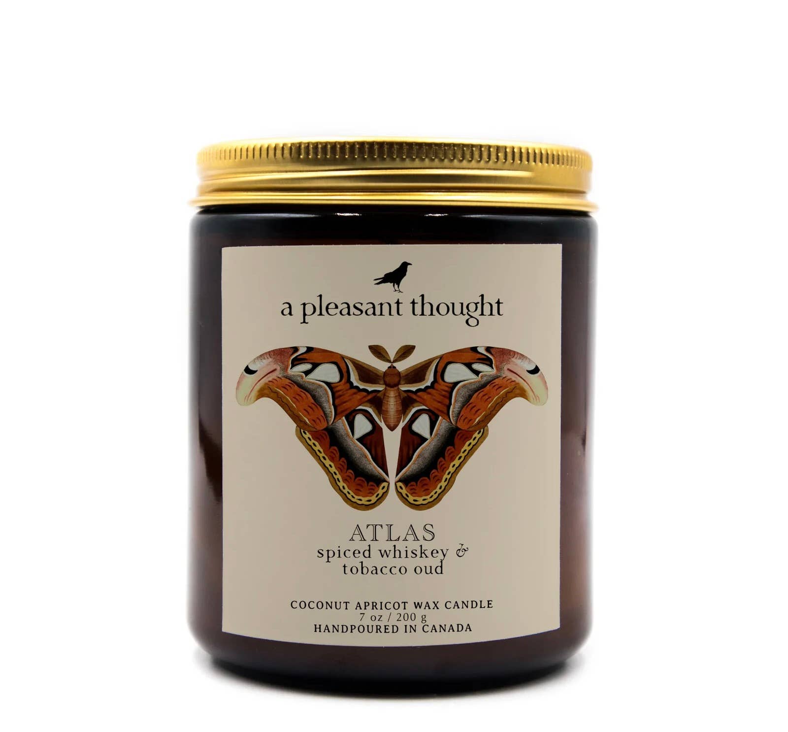 Balsamic and spicy warm woods. Discover the earthy balance of Atlas, our spiced whiskey and tobacco oud-scented candle. A luxurious, coconut apricot wax candle in an amber glass jar with a wooden wick and lid. Composed of sustainably sourced, luxurious coconut apricot wax. Free of soy and petroleum waxes. Clean wax means less smoke and soot build-up No toxic chemicals. Phthalates, parabens & sulfate-free Lead-free wooden wick. Ideal for coconut apricot wax and simulating that firewood crackle Highest quality fragrance and essential oils. Carefully sourced from the best suppliers in the industry and custom blended Vegan and cruelty-free. Strong hot and cold throws due to greater fragrance saturation by coconut apricot wax (unlike soy and other waxes) Hand-poured and cured in small batches. Handcrafted in Canada 45+ hr burn time. Perfect smaller rooms and bathrooms Reusable amber glass jar. The vessel can be used long after the candle is gone!