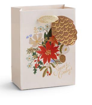 Illustrated paper gift bags with ribbon handles and a coordinating gift tag with "to" and "from" on the back.
