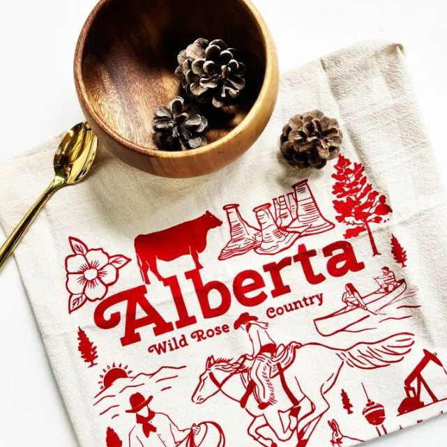 Crafted from organic cotton for absorbency and durability, it's perfect for drying dishes, lining bread baskets, or simply adding a splash of Canadian pride to your home décor. Whether you're a local, a visitor, or gifting a piece of Alberta to someone afar, this tea towel is a charming tribute to the heart of the West.