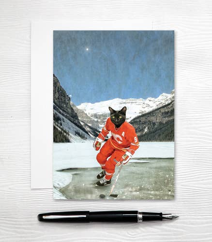 The "Cat"gary Flames playing hockey on the ice in the iconic Lake Louise, AB. Perfect for the Calgary Flames fan!