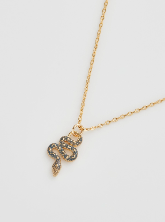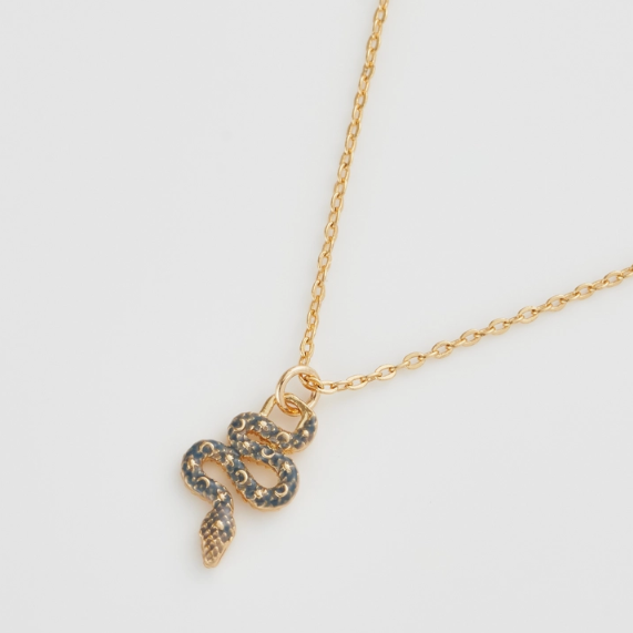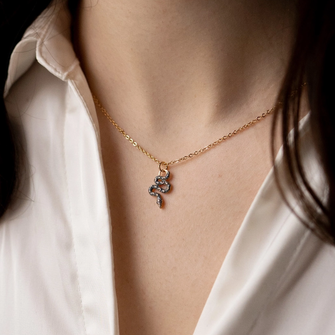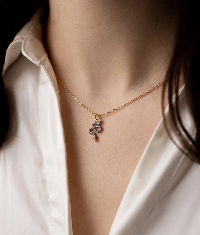 The serpentine pendant on our Celestial Snake Necklace is a stunning piece that beautifully blends artistry and elegance. Adorned with rich green enamelling, the pendant glimmers with the enchanting allure of golden stars and crescent moons, creating a celestial motif that captivates the eye. The intricate textures of the scales on the reverse side add a touch of sophistication and depth, making this necklace a true statement piece. Pair it with the matching huggie earrings to complete the ensemble, and infuse your collection with a whimsical charm that's sure to draw attention in any setting.