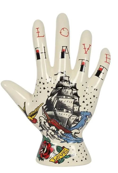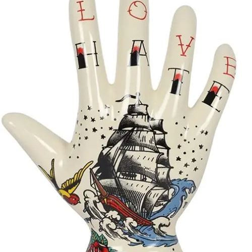 Sailor vibes meet mystic energy. This ceramic hand rocks ‘LOVE HATE’ across the fingers, a classic pirate ship tattoo, and palmistry lines for extra intrigue. Part fortune-teller, part sea dog—fully cool.