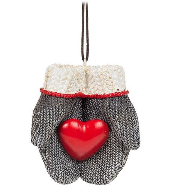 You'll definitely be smitten by this charming pair of Mittens with Heart Ornament for the holidays! Crafted out of resin, these miniature mittens holding a bright-red heart look just like the real thing, from their texture to their colour, for a captivating complement to any Christmas tree.