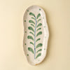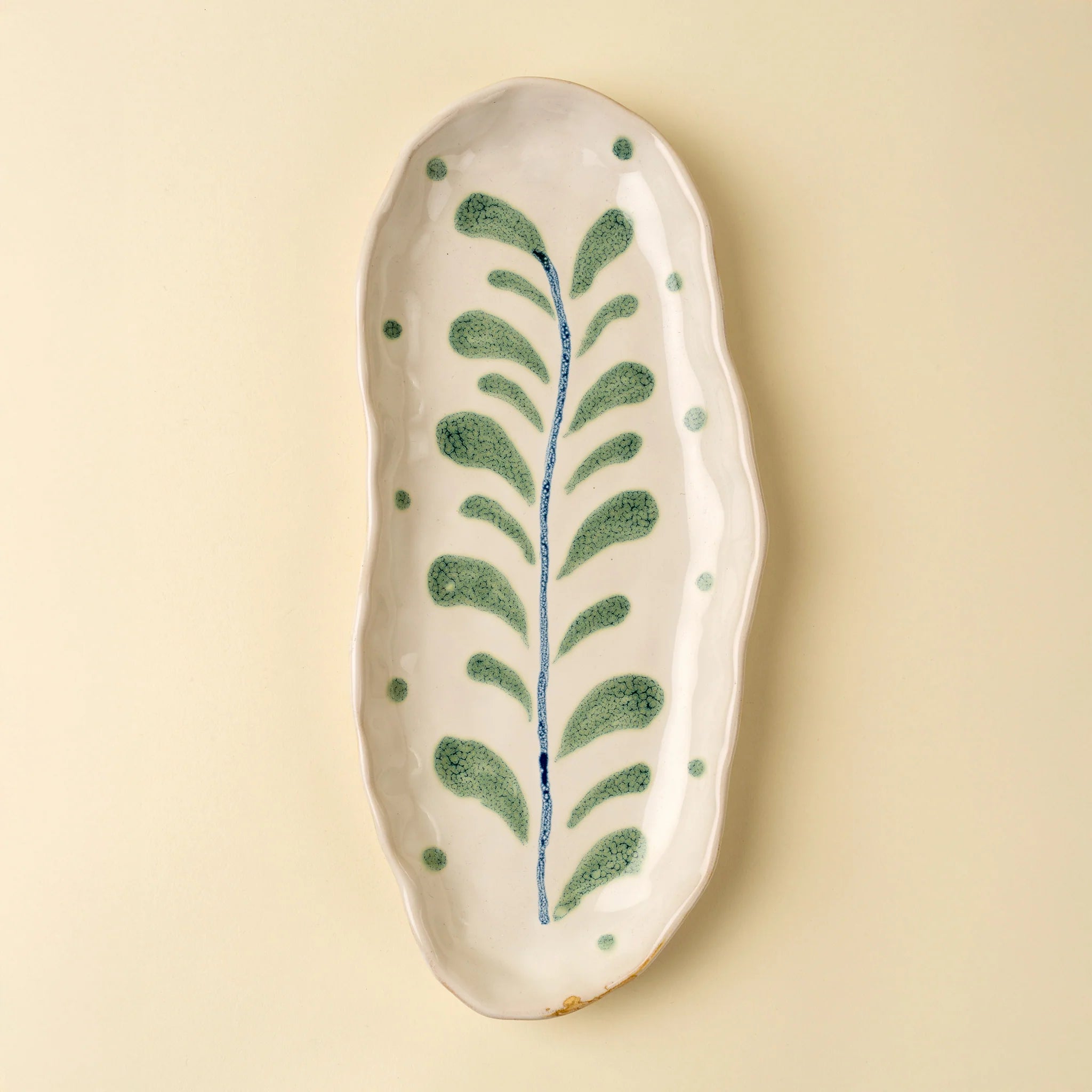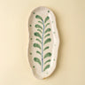 Add a touch of whimsy to everyday moments with the Painted Petals Oval Plates. Handcrafted from stoneware with an organic, hand-formed shape, this charming piece features hand-painted leafy florals reminiscent of soft watercolor brushstrokes. A creamy reactive glaze allows the natural ceramic tones to peek through, creating a look that feels relaxed, artful, and beautifully imperfect.