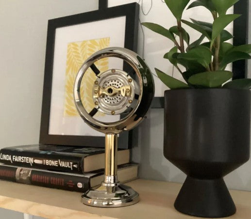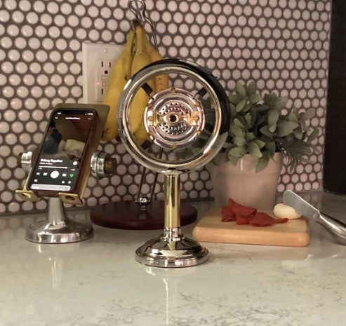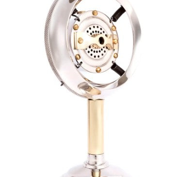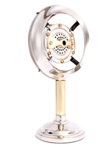 Inspired by spring-centered amplified microphones from the 30's and 40's, the Franklin Speaker features a built-in Bluetooth JBL Mini Speaker which can last up to 8 hours on a single charge. Cast of solid polished brass and aluminum. Simply pair it with your device and enjoy your favorite programming.