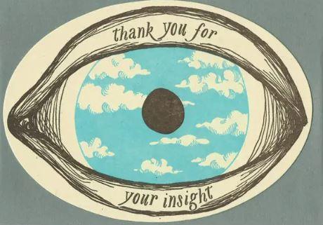 Thanks for your insight! • flat oval shaped card is letterpress printed in sky blue and dark brown ink on 100# off white paper • die cut in studio • accompanied by a 4bar steel gray envelope and packaged in a clear sleeve Inspired by the artist René Magritte and his wonderful cloud paintings, it is a great card to show your appreciation to someone that has shared their wisdom.
