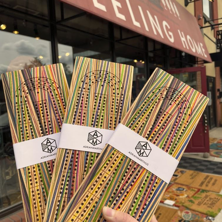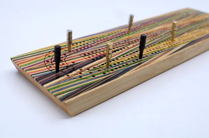 A unique take on a timeless game that will look good on any table, this 3-player cribbage board is made from repurposed materials. The top veneer features colourful skateboard accents and mixed woods that have been carefully laminated to a Maple base.