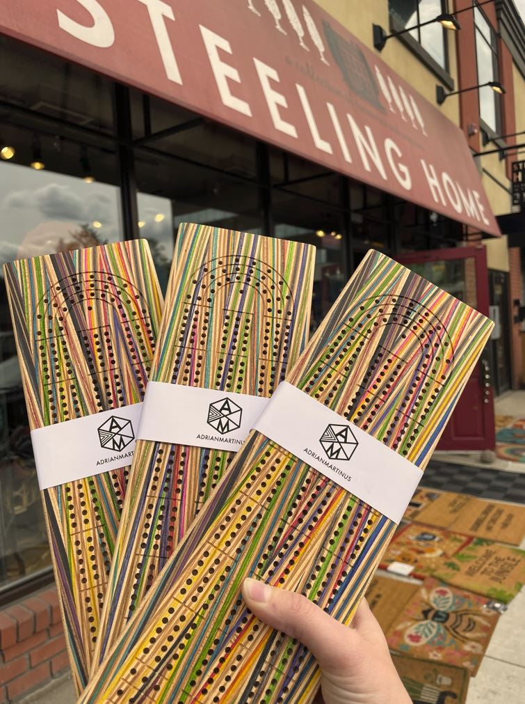 Made in Calgary from old skateboards, this cribbage board has the colour to prove it. Each one is different, depending on the boards that went into it. It’s solid, sharp, and a great way to turn worn-out skateboards into a new kind of competition.